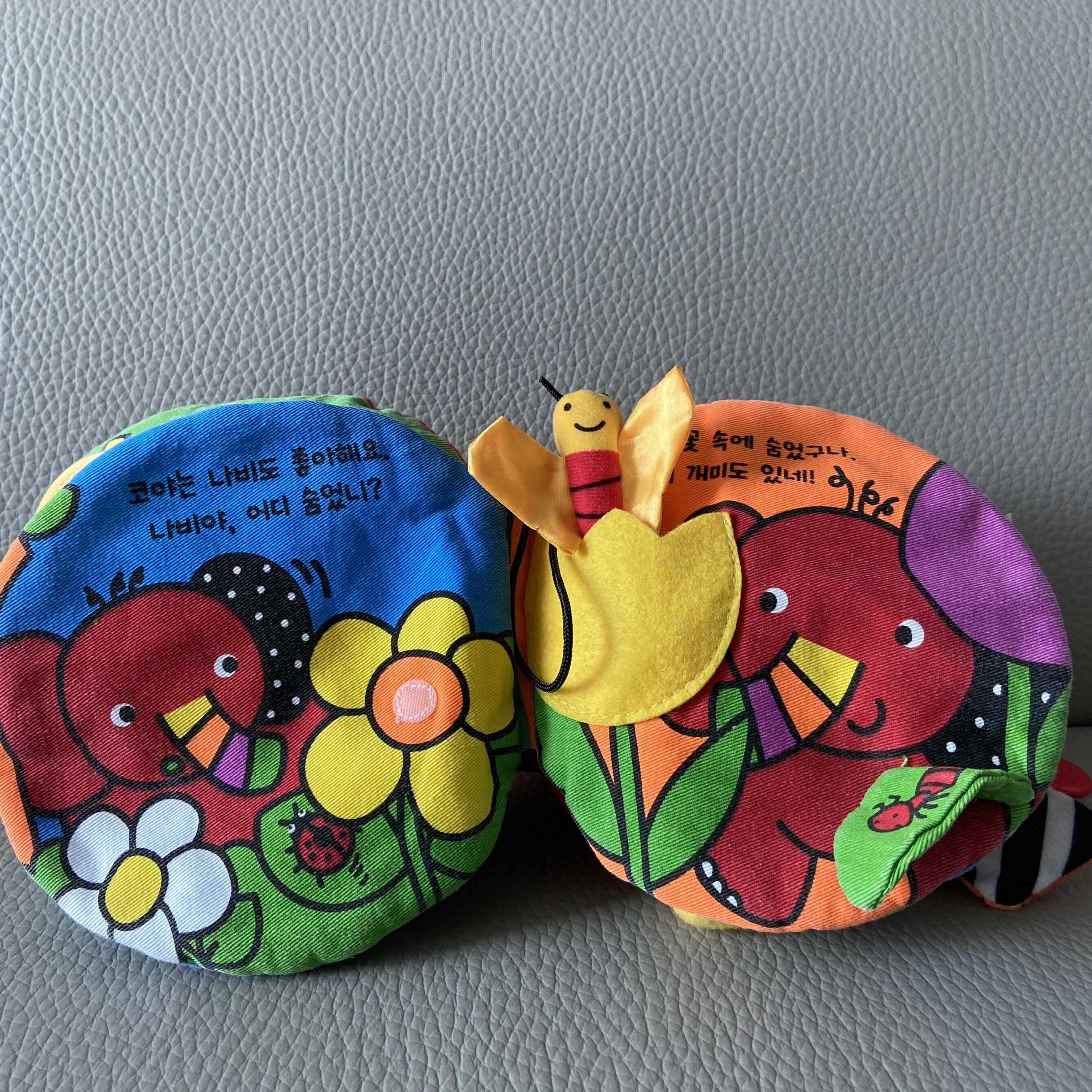 다음 페이지. 노란 꽃속에 숨어있는 나비도 있고 잎을 뒤집으면 나오는 개미도 있다. 아이가 스스로 책을 조작할 줄 알때 더욱 유용하게 읽힐 듯 한 코야. 저 나비를 빼서 팔랑팔랑 날갯짓을 하다가 아이의 코, 입, 볼에 가져다 대면 상당히 좋아한다. 색감도 알록달록해서 아이의 색감인지능력에 도움이 많이 된다.