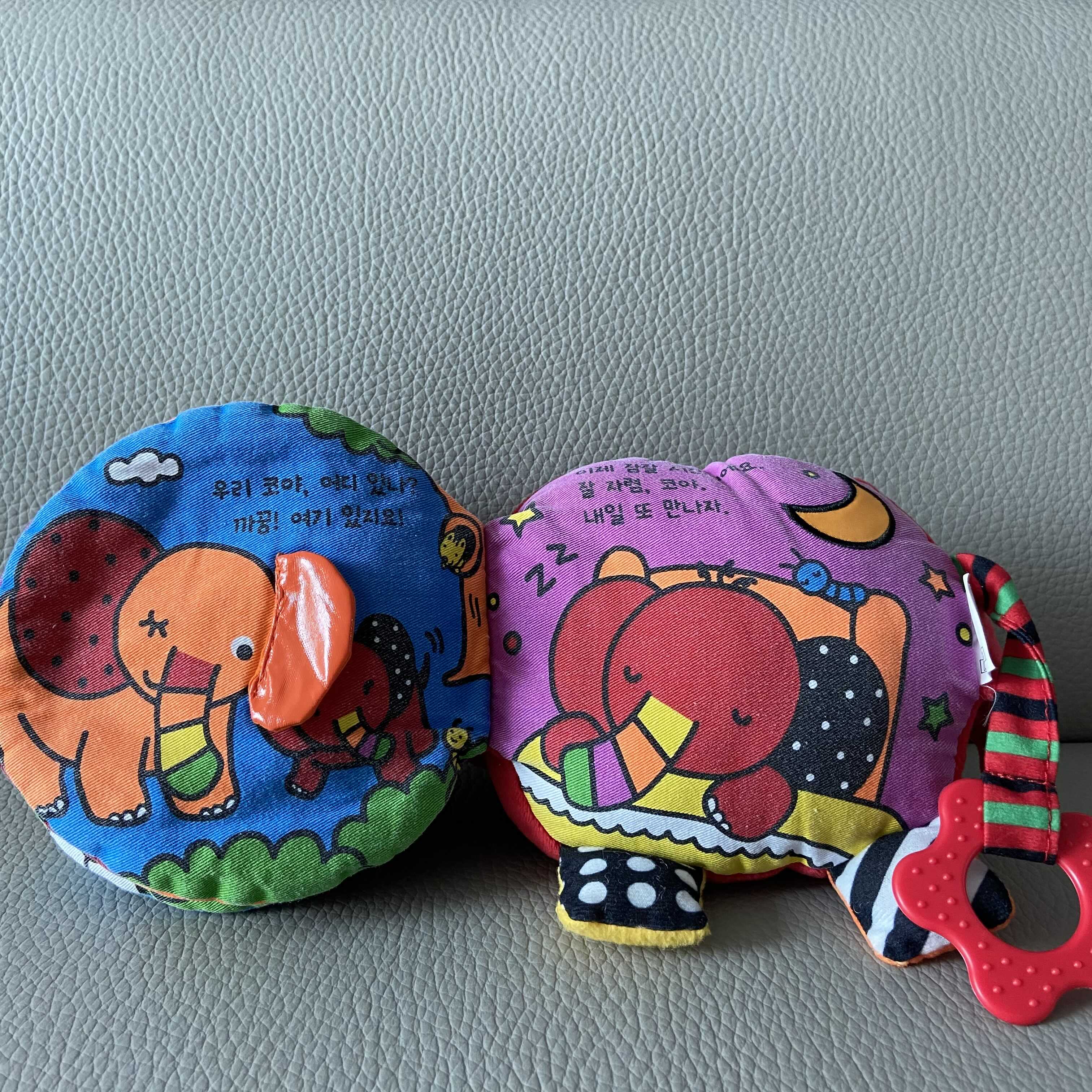 마지막 페이지. 우리 코야, 어디 있나? 부분을 엄마 코끼리, 아빠 코끼리, 할아버지, 할머니 코끼리까지 모두 등장시켜 목소리 변형해서 읽어주는데 이 부분도 상당히 관심을 가지고 본다. 귀도 까꿍! 할 수 있고. 전체 6페이지로 구성된 짧은 코야의 하루. 집중력이 짧은 시기인 아이들이 충분히 관심을 가질만한 요소들을 모두 넣되 지겹지 않게 구성 되어있다. 코야의 꼬리는 아이가 손으로 잡으며 놀기도 하고 물기도 하는데 소근육 발달 및 치발기 대용으로 사용이 가능하다.