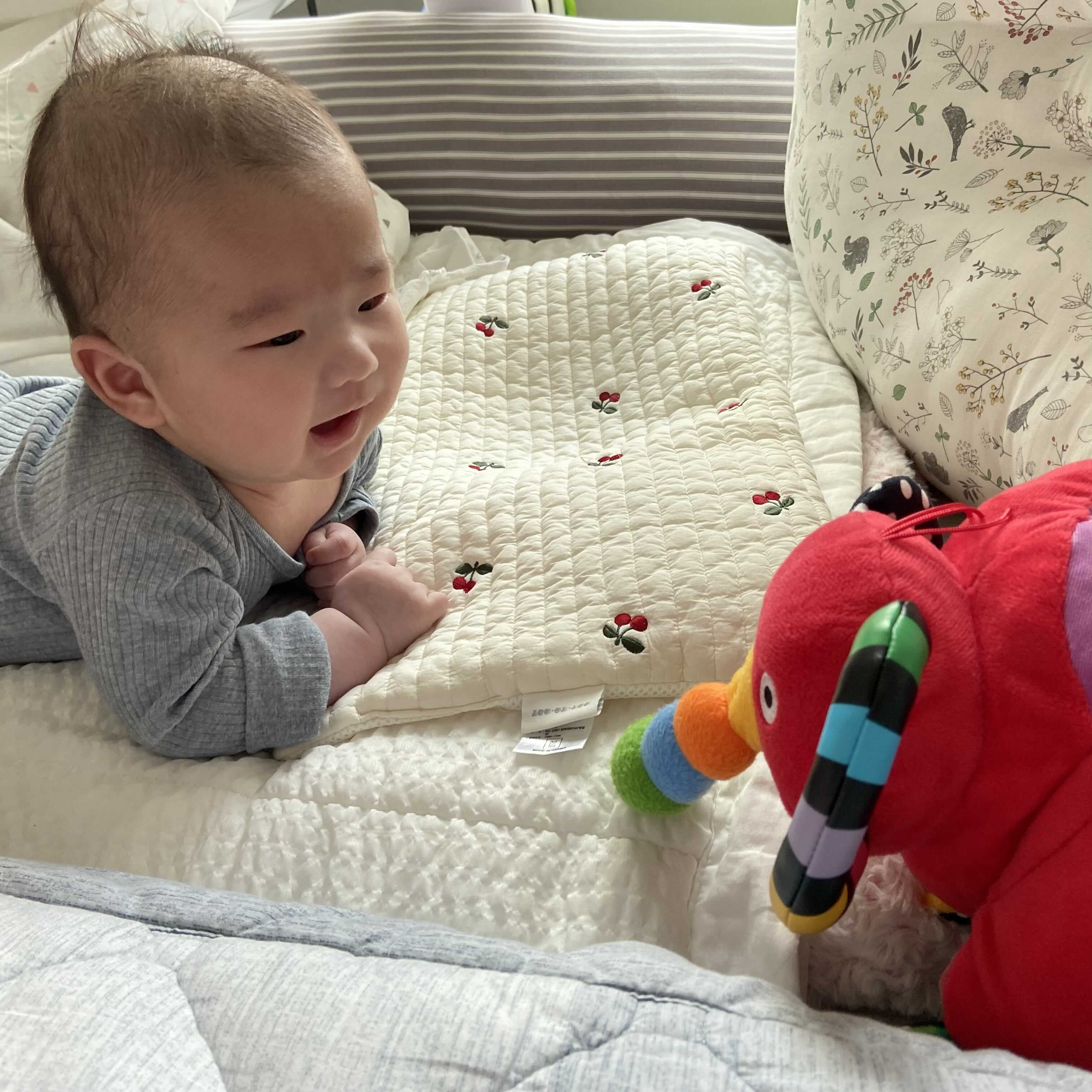 마지막으로 너무나 사랑하는 우리 아이. 한창 터미타임 연습중인데 다들 깜짝볼, 꼬꼬맘 등 틀어줄때 개인적으로 꼬꼬맘, 깜짝볼은 아이에게 너무 자극적인것 같다는 생각이기에…나는 코야를 두고 터미타임 연습을 시킨다. 충분히 관심을 가지고 보기 때문에 터미타임용 장난감으로도 추천한다.
