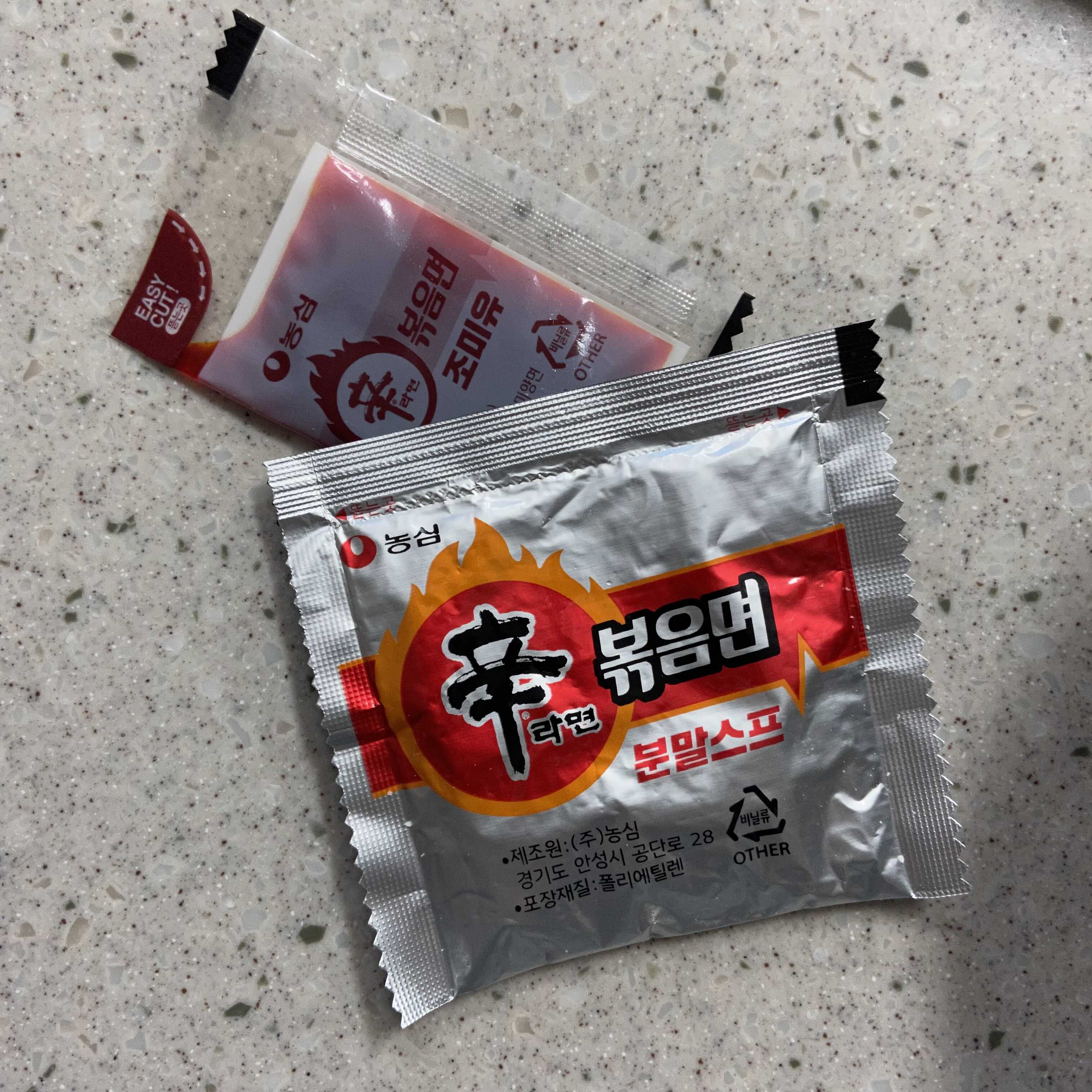 동봉된 신라면 볶음면 분말스프와 조미유. 분말스프만 넣으면 빡뻑해서 잘 안비벼 질 수도 있으니 조미유도 꼭 함께 넣어 비벼드시길 바란다.