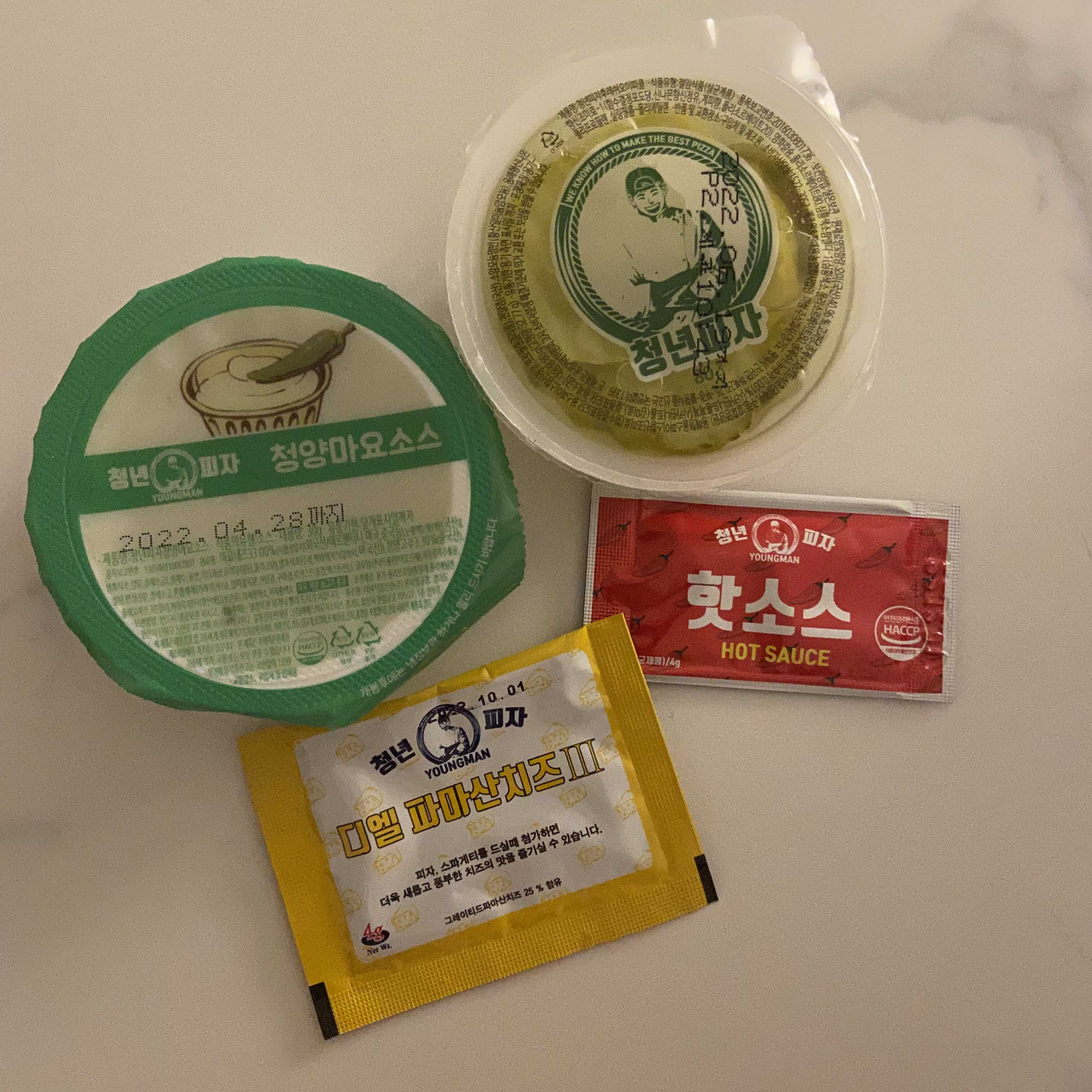 청년피자의 장점! 청양마요소스, 파마산 치즈, 핫소스, 피클이 모두 제공된다. 청양마요소스가 별미다. 보통 갈릭소스에만 먹어왔는데 매콤함을 좋아하는 우리는 갈릭소스보다 맛있게 찍어 먹었다. 청년피자를 주문해서 드시는 분들 청양마요소스에 꼭 찍어 먹어보시길 바란다.