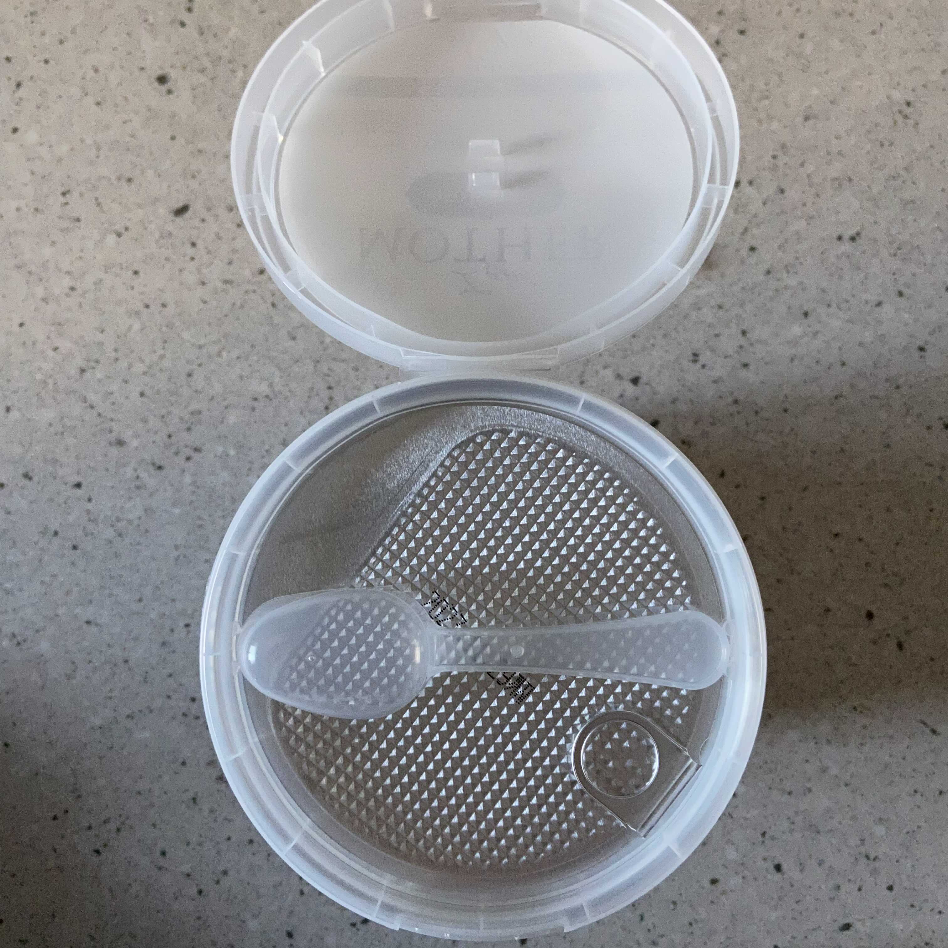 뚜껑을 오픈하면 보이는 스푼과 안심마개. 스푼을 뜯은 후 뚜껑 상단에 끼워놓거나 분유통위에 얹어 놓으면 된다. 초보엄마였던 나는 정말 아무 것도 몰랐기에 모든 분유통에 이렇게 스푼이 들어있다는 것도 굉장히 놀랬다. (분유를 직접 타 보기전 뭘로 타서 주지…?라며 숟가락 소독을 해야하나하고 걱정을 했었다. 하하)