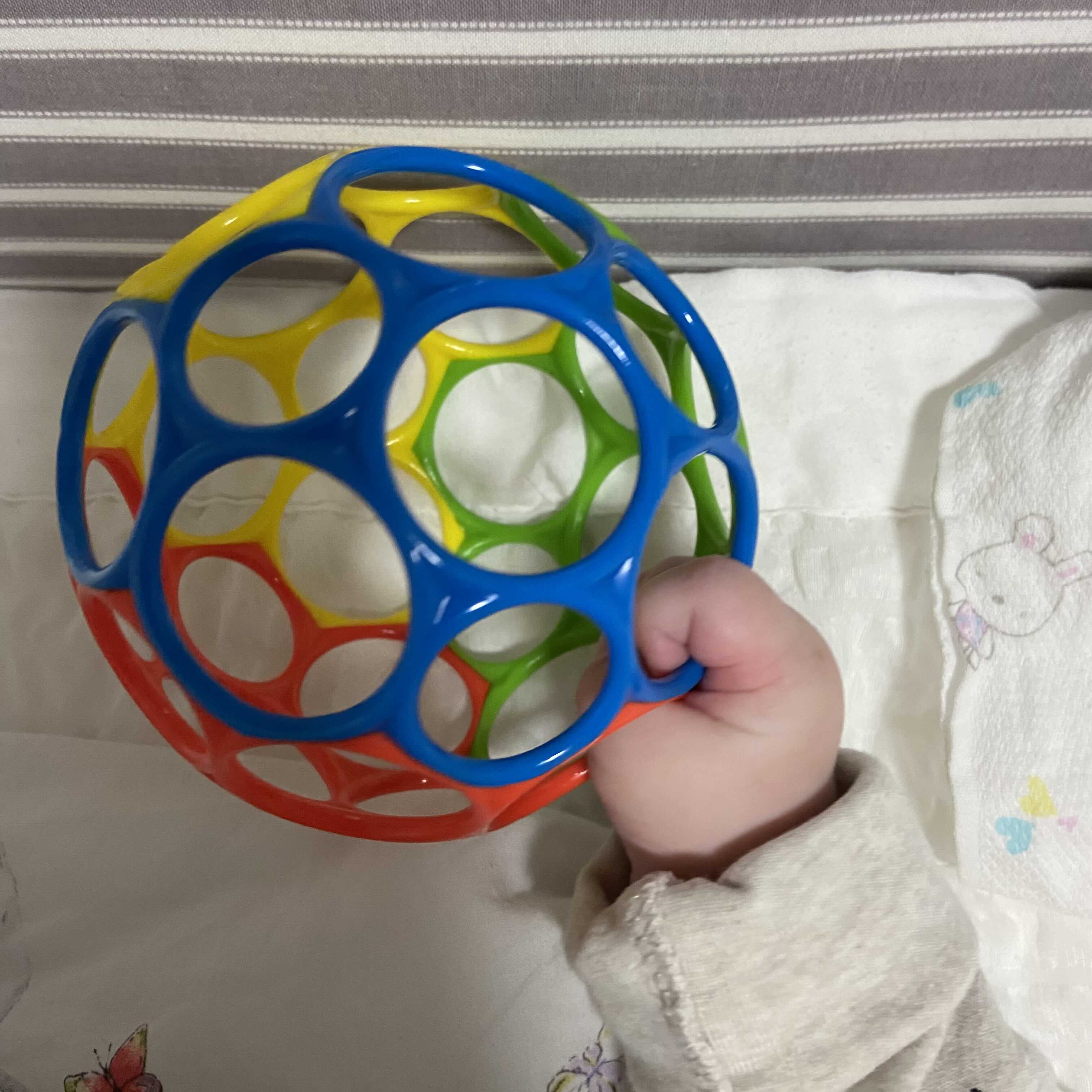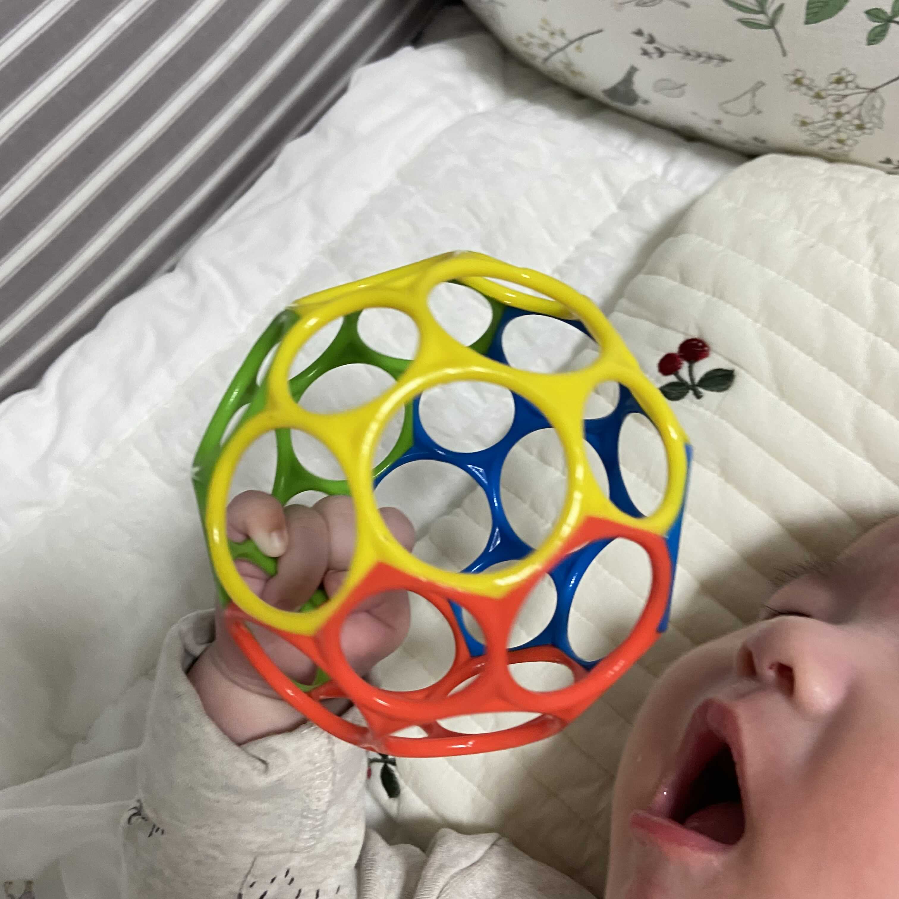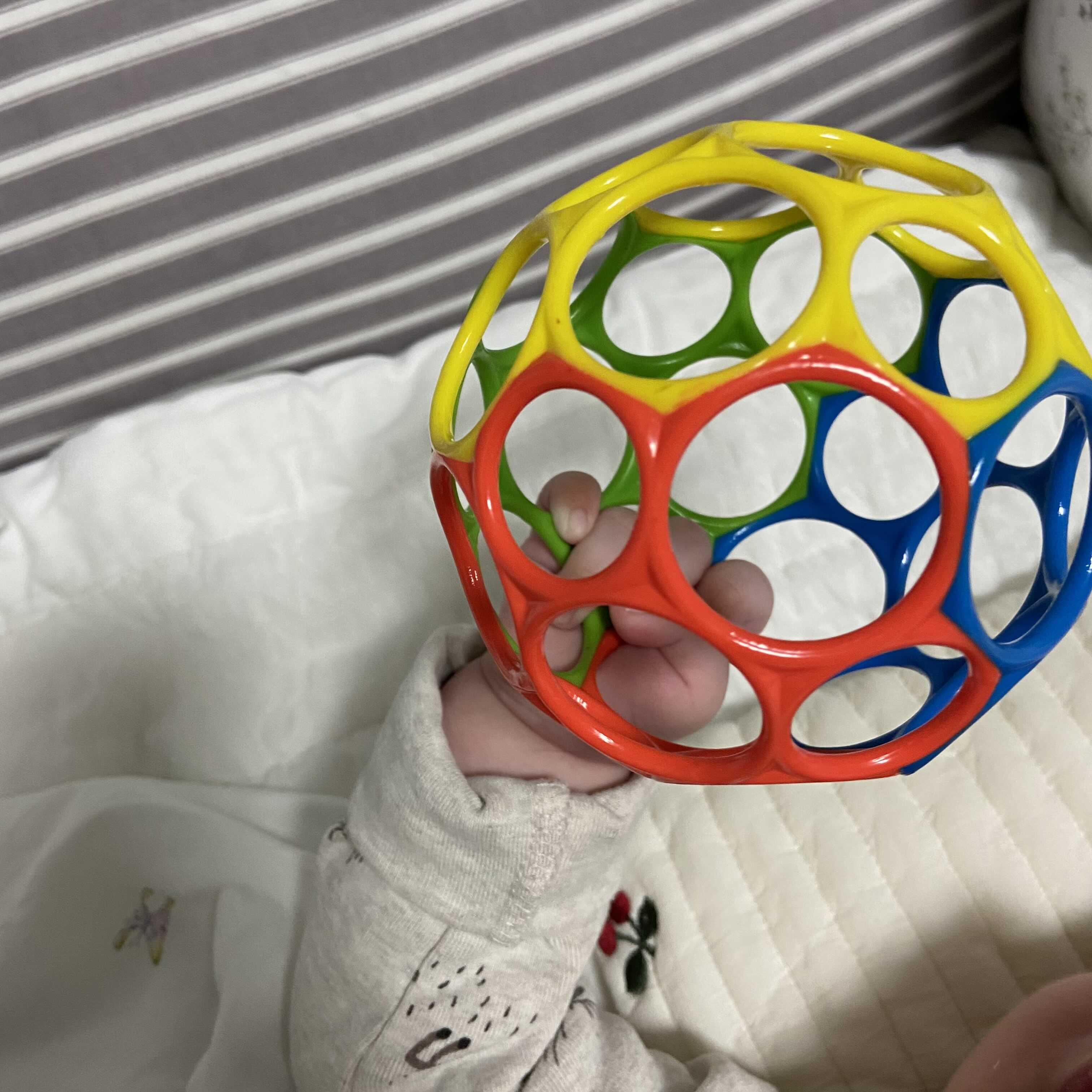 손으로 꽉 쥐고 있는 모습을 담아보려 했다. 처음에는 한손으로만 가지고 놀더니 요즘에는 두손다 오볼의 구멍에 손을 넣어 쥐어보며 스스로 잘 논다.